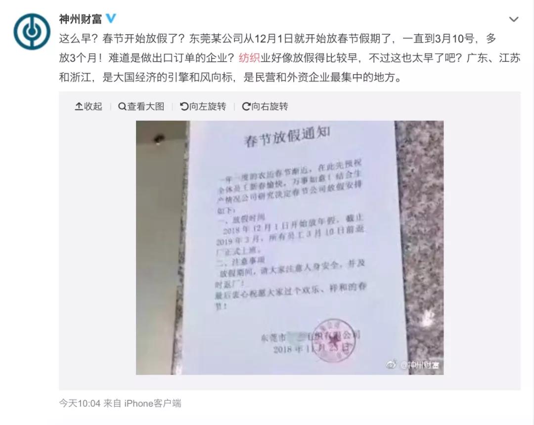 网友神州财富认为,这么早?春节开始放假了?东莞某公司从12月1日就开始放春节假期了,一直到3月10号,多放3个月!难道是做出口订单的企业?纺织业好像放假得比较早,不过这也太早了吧?广东、江苏和浙江,是大国经济的引擎和风向标,是民营和外资企业最集中的地方。