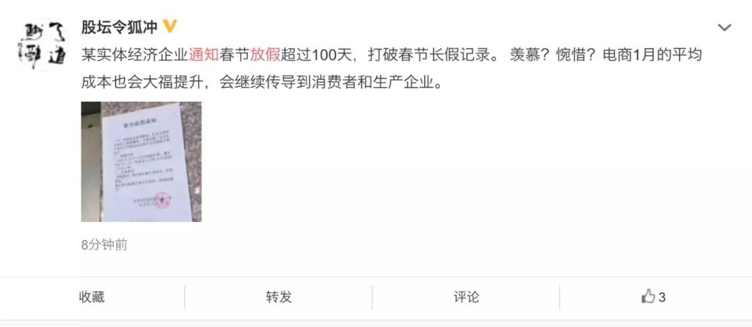 网友股坛令狐冲认为,某实体经济企业通知春节放假超过100天,打破春节长假记录。 羡慕?惋惜?电商1月的平均成本也会大福提升,会继续传导到消费者和生产企业。
