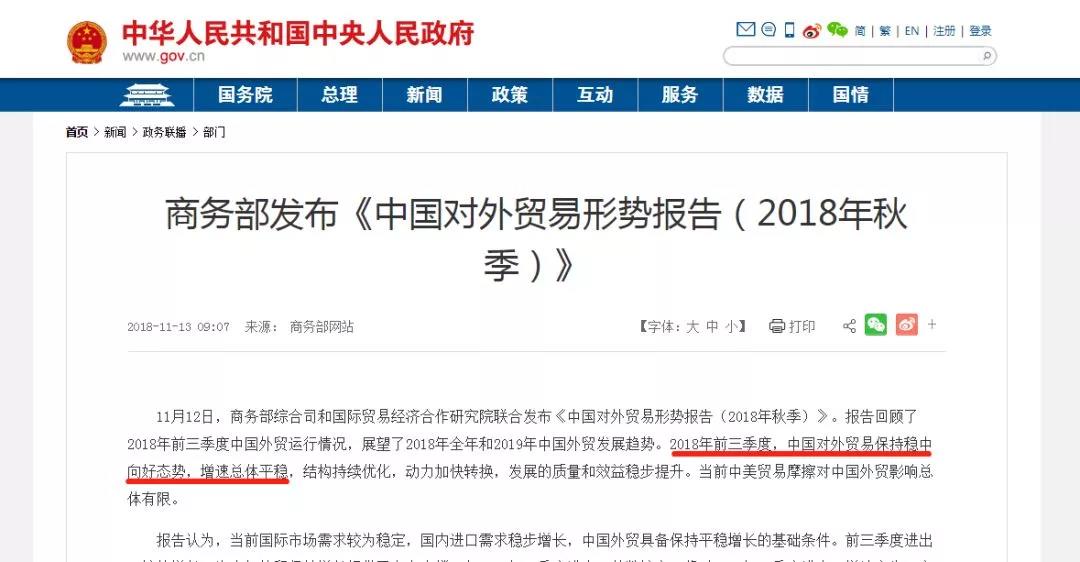 而在发布的中国对外贸易形势报告(2018年秋季)中指出,前三季度进出口较快增长,为全年外贸保持增长提供了有力支撑。但2017年四季度进出口基数较高,将对2018年四季度进出口增速产生一定的影响。