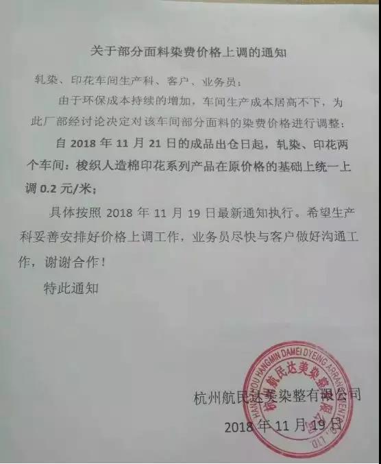 11月19日,浙江印染巨头航民发布染费上涨通知,曾引起业内的广泛关注。大家都在关心,其它染企是否会跟涨。