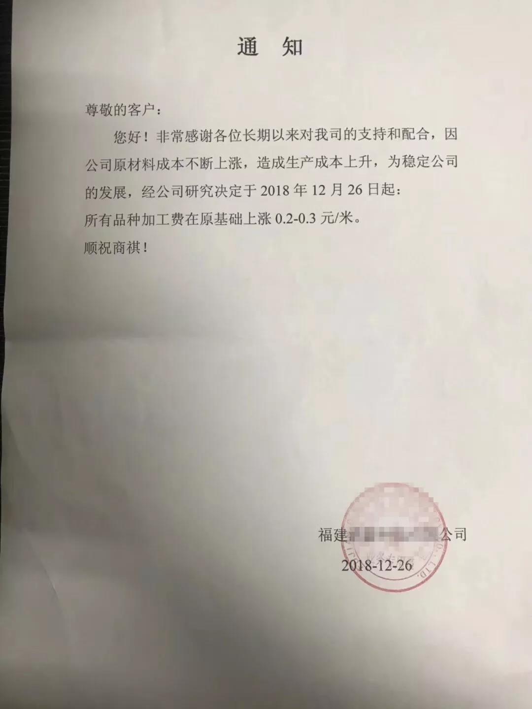 就在这时,福建却传出一则染费涨价通知:因原材料成本不断上涨,造成生产成本上升,为稳定公司的发展,2018年12月26日起:所有品种加工费在原基础上涨0.2-0.3元/米。