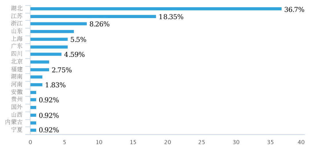 参与调查的109家企业来自于国内16个省、直辖市,涉及纱线、面料、针织、服装、产业用等领域。其中,来自湖北省的占36.7%。