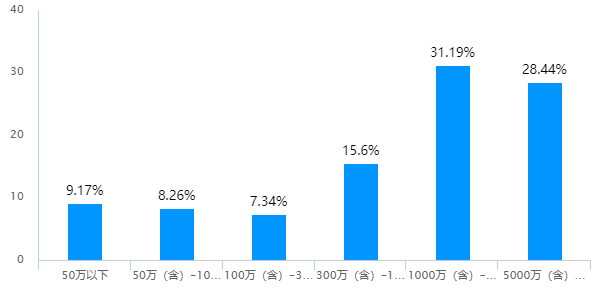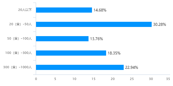 其中,企业员工人数为20-50人的占比最多,达30.28%;其次是300-1000人的,占22.94%。
