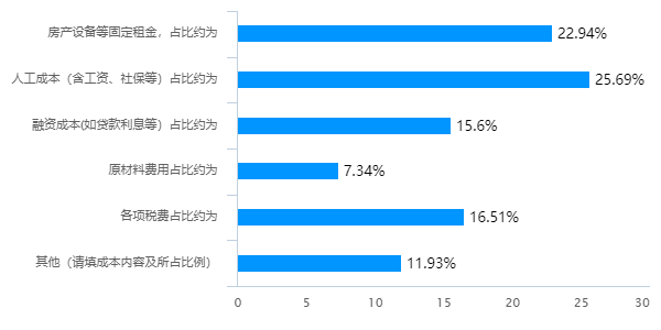 企业在延迟复工期间承担的固定成本占比依次为人工成本、房产设备等固定租金、各项税费、融资成本、原材料费用成本、其他(能耗、延期交货违约金、物流)等,具体比例如图所示: