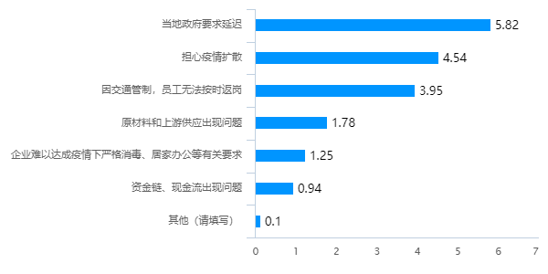 延迟复工的主要原因依次为当地政府要求延迟、担心疫情扩散、交通管制无法返岗、原材料和上游供应出现问题、企业难以达成疫情下严格消毒等要求、资金链出现问题以及商场百货专柜销售停滞等。