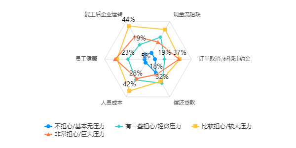 目前,企业负责人最担心的问题依次为员工健康、订单取消或延期违约金、复工后如何运转、人员成本、现金流、还贷等,具体如图所示: