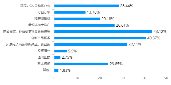 针对疫情影响,受调查企业已经或预计采取的措施按比例依次为:申请贷款、补贴或专项资金扶持等,创新产品服务,拓展电子商务等新渠道、新业务,远程办公,促销或加大推广,降薪或裁员,分包订单,投资海外等。值得注意的是,其中有23.85%的企业暂无措施,2.75%的企业选择退出止损。