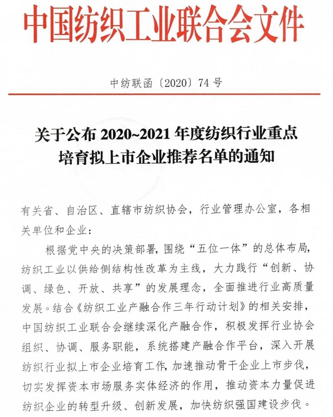 据了解,根据《纺织行业产融合作三年行动计划》,中国纺织工业联合会通过两年时间的探索,统筹行业整体情况并建立了相关数据库,每年向国家发改委、工信部、证监会、交易所等政府部门和单位推送《纺织行业重点培育拟上市企业名单》,与相关政府部门、金融机构、中介机构紧密合作,加速搭建产融合作平台。中国纺联自2018年开展纺织行业重点培育拟上市企业工作以来,共有近百家企业提出申请。迄今为止,推荐名单中有5家企业成功上市,另有9家企业已经在会审核。