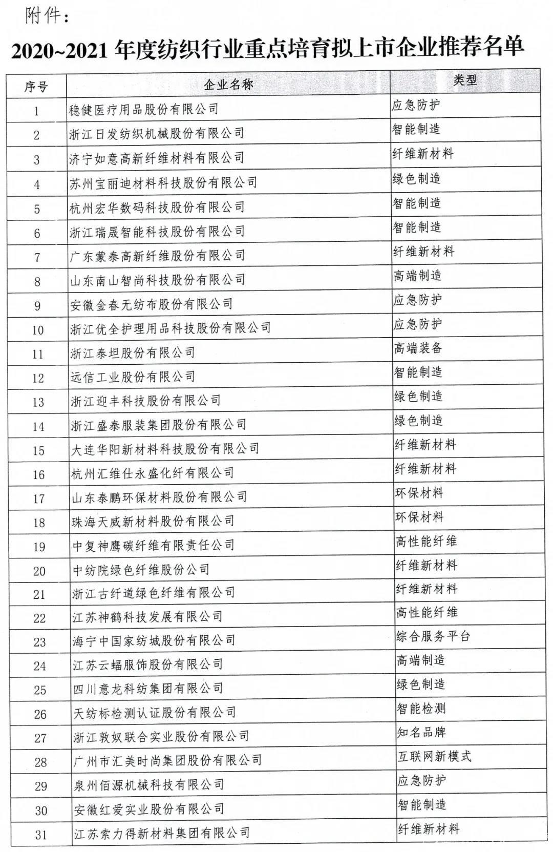 近日,中国纺织工业联合会公布了2020-2021年度纺织行业重点培育拟上市企业推荐名单,有31家纺织企业上榜,主要类型包括绿色制造、智能制造、应急防护、纤维新材料等。