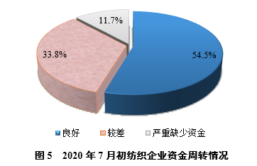 资金周转调查显示,7月初,资金周转良好的企业占54.5%,环比上升3.9个百分点,同比下降3.3个百分点;资金周转较差的占33.8%,环比下降1.3个百分点,同比上升4.9个百分点;严重缺少资金的占11.7%,环比下降2.6个百分点,同比下降1.6个百分点(如图5)。