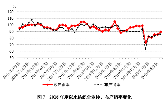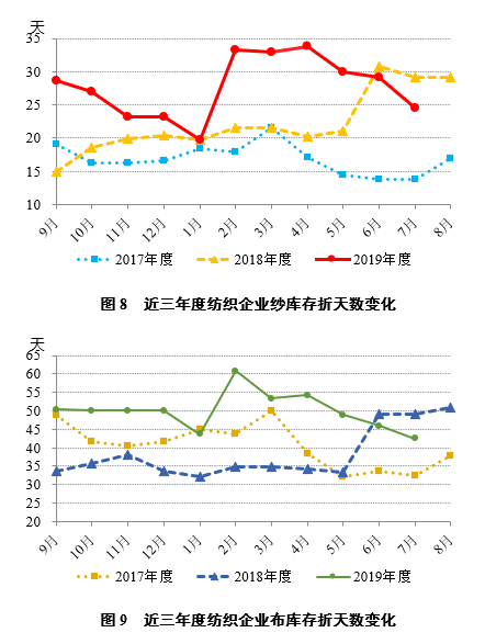 7月初,被抽样调查企业纱产销率为89.8%,环比上升4.3个百分点,同比下降1个百分点,比近三年同期平均水平下降6.1个百分点;库存为24.4天销售量,环比减少4.8天,同比减少4.7天,比近三年同期平均水平高4.6天(如图7、图8)。布的产销率为86.2%,环比上升1个百分点,同比下降5.6个百分点,比近三年同期平均水平低9.7个百分点;库存为42.5天销售量,环比减少3.5天,同比减少6.7天,比近三年同期平均水平高0.7天(如图7、图9)。