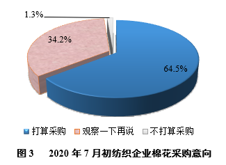采购意向调查显示,7月初,准备采购棉花的企业占64.5%,环比减少0.5个百分点,同比上升7.8个百分点;持观望态度的占34.2%,环比上升3个百分点,同比下降3.1个百分点;不打算采购棉花的企业占1.3%,环比下降2.6个百分点,同比下降4.7个百分点(如图3)。