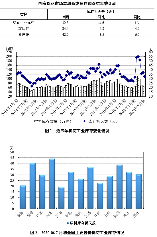 国家棉花市场监测系统抽样调查显示,截至7月初,被抽样调查企业棉花平均库存使用天数约为32.8天(含到港进口棉数量),环比减少4.6天,同比增加1.3天。推算全国棉花工业库存约63万吨,环比减少12.6%,同比减少8.6%(如表、图1)。全国主要省份棉花工业库存状况不一,河北、福建、陕西三省棉花工业库存折天数相对较大(如图2)。