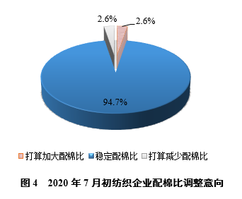 7月初,94.7%的抽样企业打算稳定配棉比,环比下降0.1个百分点,同比上升2个百分点;2.6%的企业打算加大配棉比,环比上升1.3个百分点,同比上升0.2个百分点;2.6%的企业打算降低配棉比,环比下降1.3个百分点,同比下降2.2个百分点(如图4)。