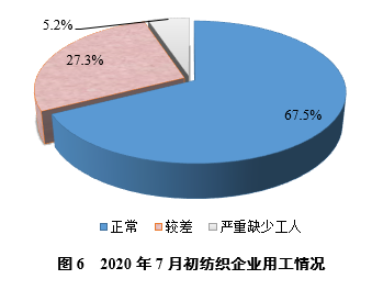 7月初,67.5%的抽样企业用工情况正常,环比上升1.3个百分点,同比上升0.1个百分点;27.3%的企业用工情况较差,环比下降1.3个百分点,同比上升2个百分点;5.2%的企业严重缺少工人,环比持平,同比下降2个百分点(如图6)。