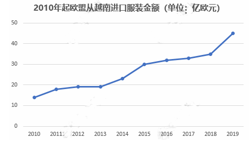 近几年来,越南出口欧盟的服装金额逐渐攀升。2019年,越南对欧盟的出口额已经从2000年的28亿美元增长至了415.4亿美元,其中逾50亿美元为服装出口额,出口占比超过10%。而近几年欧盟从越南进口服装金额也保持在稳定增长的状态中,去年的增速为28.6%左右。