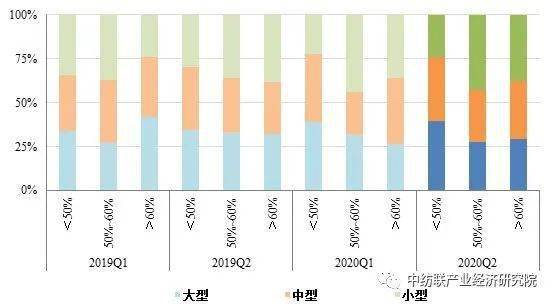 从企业规模看,中小型企业资产负债水平高于大型企业,二季度资产负债率低于60%的大、中、小型企业占比分别为80%、76.9%和74.2%,一季度分别为81%、72.7%和73.8%。从产业链结构看,具有资本技术密集特征的棉纺织、印染和纺机行业资产负债水平偏高,反映资产负债率高于60%的被调查企业数占比均超过20%;终端的家纺行业反映资产负债率超过60%的被调查企业数占比较高,达到30.3%,较一季度提高0.7个百分点。