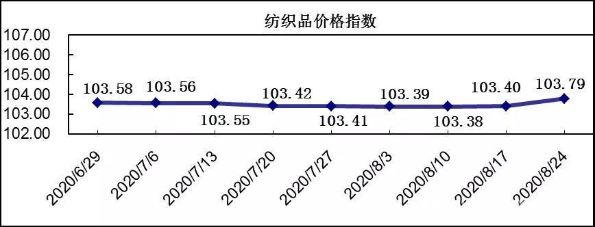 “中国·柯桥纺织指数”20200824期纺织品价格指数收报于103.79点,环比上涨0.38%,较年初下跌1.28%,同比下跌1.56%。