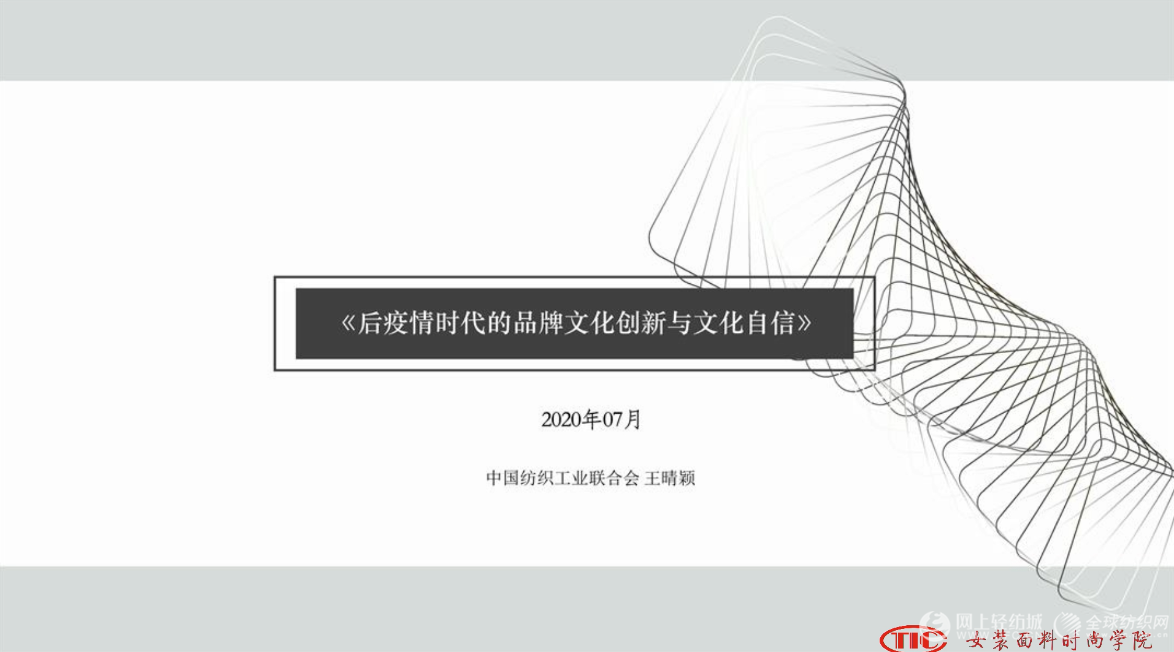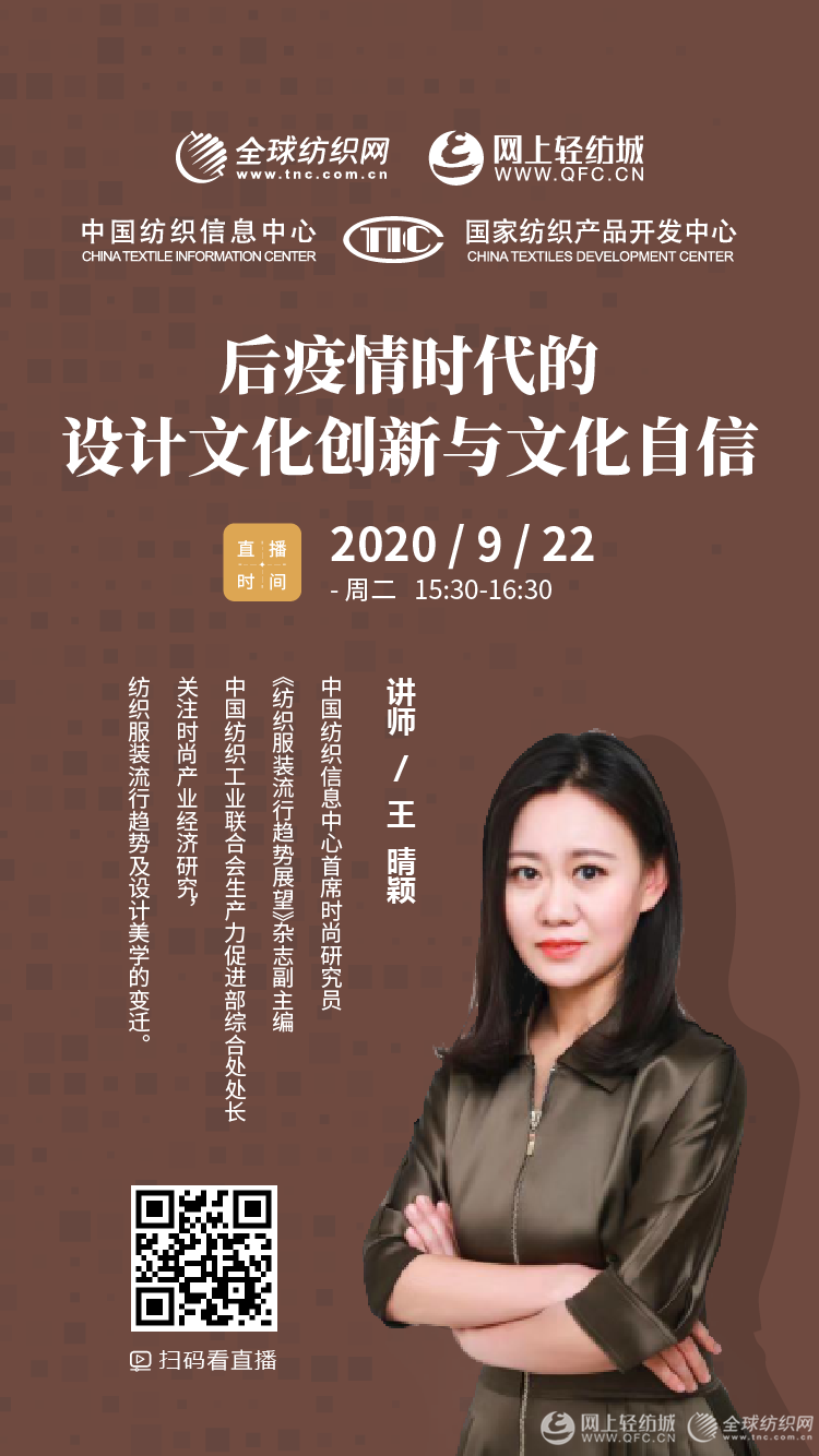 今天下午,全球纺织网纺织大讲堂特邀中国纺织信息中心首席时尚研究员、《纺织服装流行趋势展望》杂志副主编、中国纺织工业联合会生产力促进部综合处处长王晴颖女士做客本网直播间,为我们带来“后疫情时代的设计文化创新与文化自信”的主题分享。本次课程由中国纺织信息中心/国家纺织产品开发中心和全球纺织网共同举办。据了解,王晴颖在时尚产业经济领域有着丰富的研究经验,对纺织服装流行趋势及设计美学的变迁有着独到、专业的认知与见解。