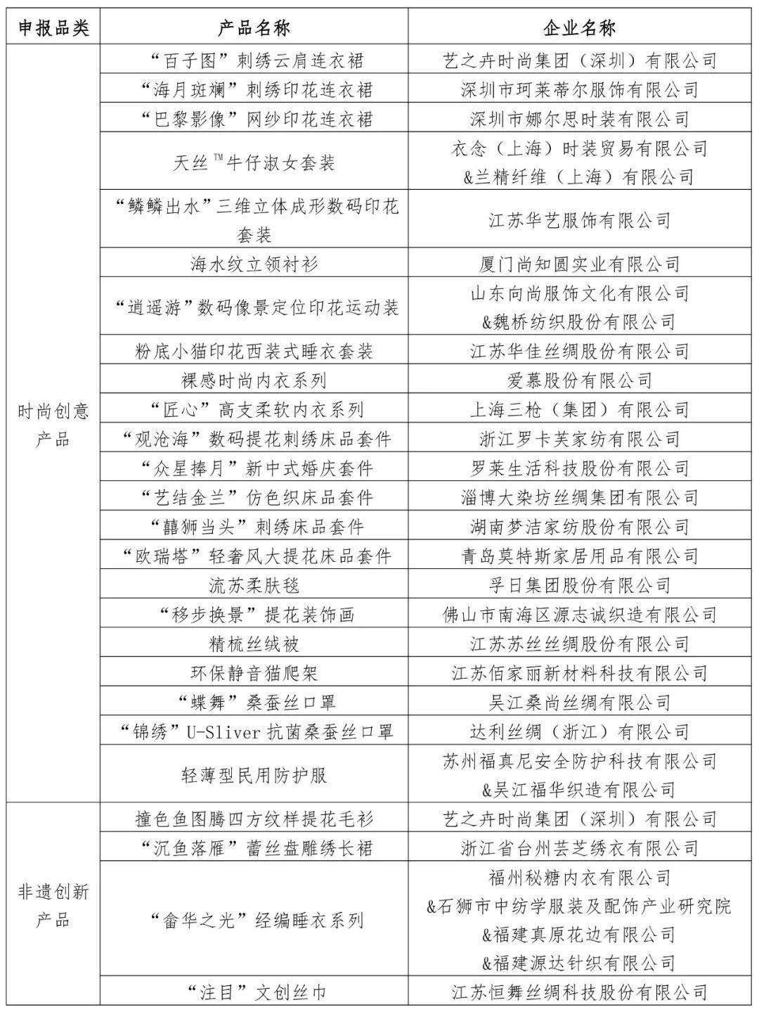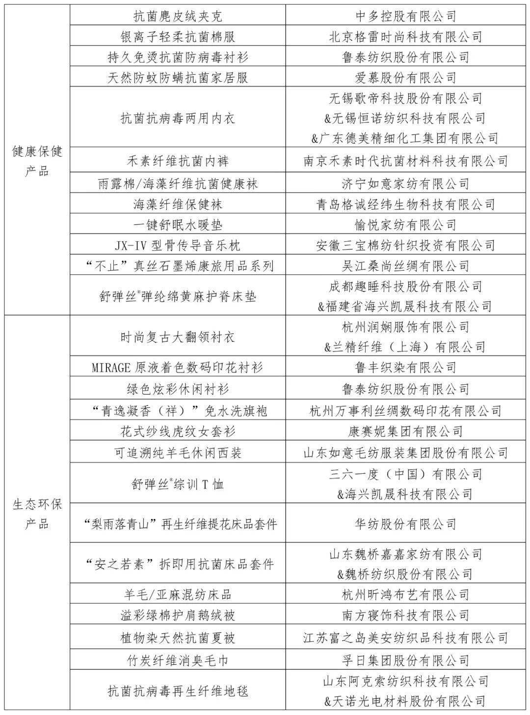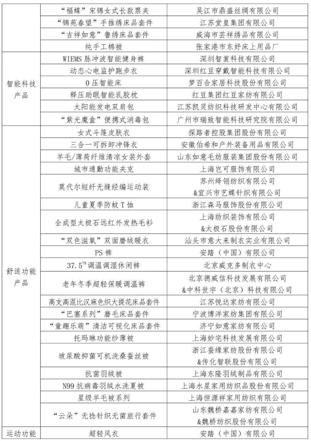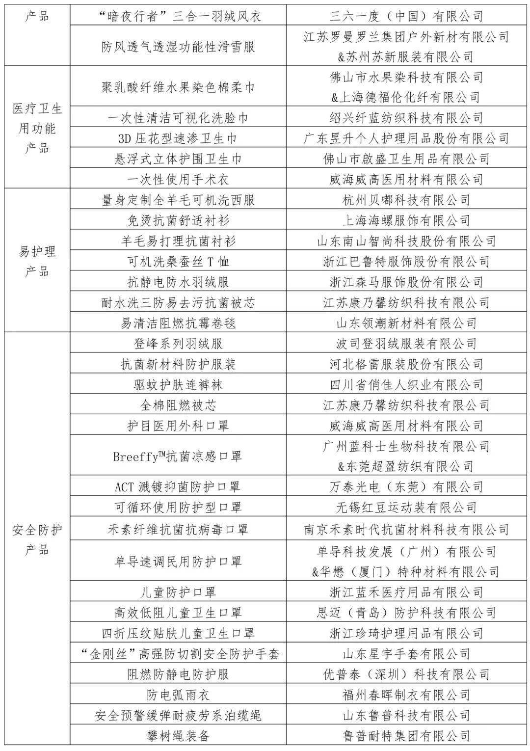 培育和推广2020年度十大类纺织创新产品获选产品及单位名单