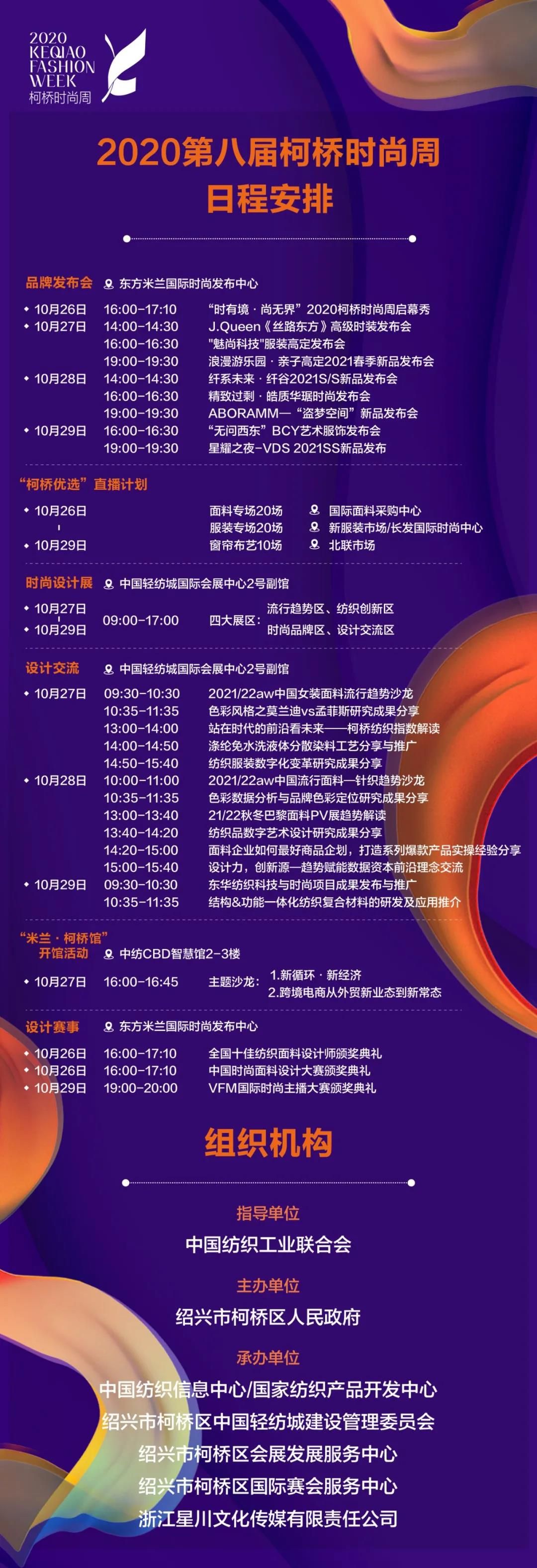 今日,柯桥时尚周主办方在官方平台发布了2020第八届柯桥时尚周的官宣及日程安排。活动将在10月26日开始,为期4天。值得关注的是,展会期间柯桥区还将同期举办第3届世界布商大会、第22届中国绍兴柯桥国际纺织品博览会(秋季)、2020中国柯桥国际纺织品印花工业展等活动,共同推进纺织产业转型升级。