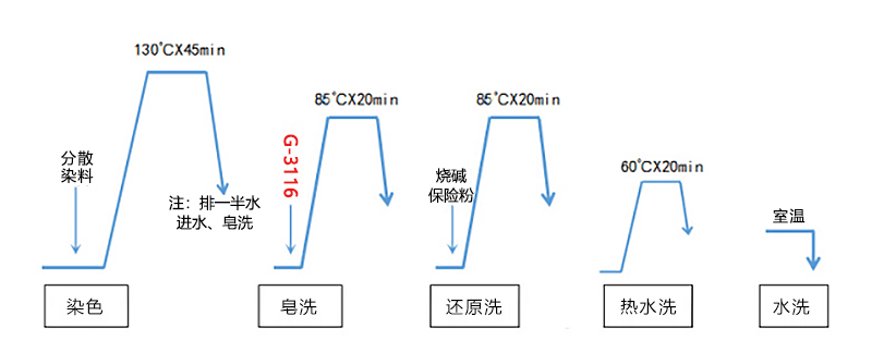 工艺流程: 染色→本品皂洗(3g/L 85℃×20min)→还原洗→热水洗→冷水洗→定型(加牢度提升剂G-3014 (干布加30g/L,湿布加50g/L) 一浸一轧 140℃*100″)