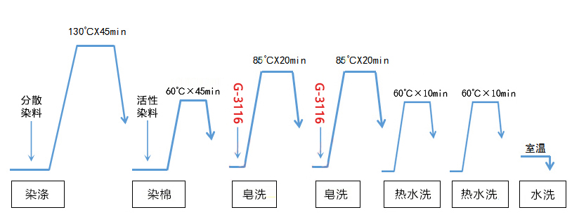 工艺流程:染涤→染棉→本品皂洗2次(3g/L 85℃×20min)→热水洗2次→冷水洗→定型(加牢度提升剂G-3014 (干布加30g/L,湿布加50g/L) 一浸一轧 140℃*100″)