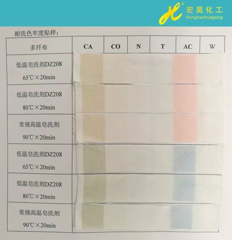 对比低温皂洗剂DZ208在65℃皂洗20分钟,80℃皂洗20分钟与常规高温皂洗剂95℃皂洗20分钟对比皂洗牢度。