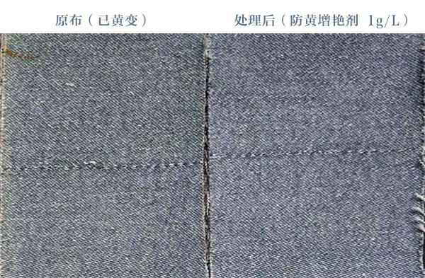 如果已经黄变的牛仔布,该如何补救呢?可以通过使用防黄增艳剂,将颜色去黄提鲜,重现纺织品的本色。如下图所示: