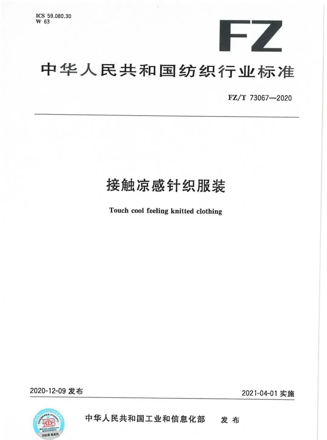 随着功能性服装的日益流行,以及凉感纺织品技术上的成熟,纺织品的凉感功能已经进入实用阶段,为了规范市场上的不良炒作,以及对凉感纺织品有一个正确的评定,相关部门制定的两项关于凉感纺织品的产品标准,一个是FZ/T 73067-2020 《接触凉感针织服装》,一个是FZ/T 62042-2020 《凉感面料床上用品》,这两项标准将于2021年4月1日正式实施,这也标志着在纺织品的功能性产品中,凉感纺织品也开始正式有标准可依。