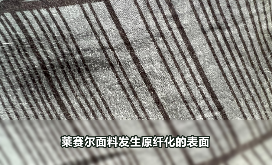 天丝莱赛尔面料的原纤化,是指在湿态下,莱赛尔纤维发生横向剧烈膨胀(40%),结晶体间分子作用力减弱,表层在机械摩擦(如绳状染色、工业酵洗、家庭洗涤等)作用力下,沿轴向多次劈裂,最终形成几乎透明(比表面积增大导致)的纳米级原纤。莱赛尔面料在机械摩擦中,纱线中的毛羽也会跑出来,当毛羽间、纳米原纤间以及毛羽与纳米原纤纠缠在一起时,就会形成起毛起球。