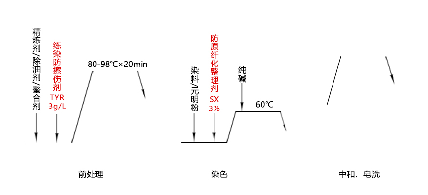 推荐工艺:前处理(建议平幅除油工艺或冷堆)→ 锁纤染色同浴 → 中和 → 皂洗 → 固色 → 过软 → 烘干