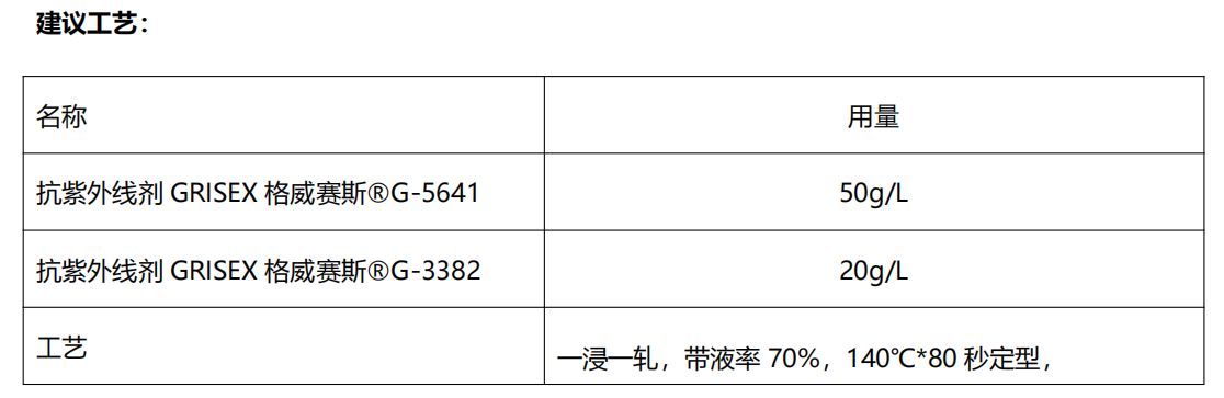 随着消费者需求提高,用CVC平纹布做户外运动服、防晒衣、露营装备内衬,要求30次水洗后UPF仍大于45,长时间户外穿着依然舒适。通过市场需求,我司开发出一支抗紫外线整理剂GRISEX格威赛斯®G-5641配套抗紫外线整理剂GRISEX格威赛斯®G-3382,可做到UPF50+以上,持久防晒,通过筛选开发,我们为客户特制定此方案,供有相似需求的面料品牌企业参考。