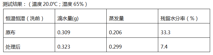 涤氨黑色针织布经过 多功能吸湿速干剂格威赛斯®G-2638处理后水份残余率达到7.4%,符合客户的要求。