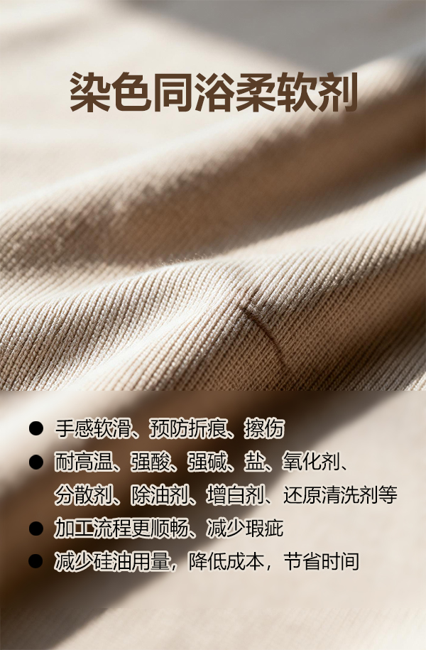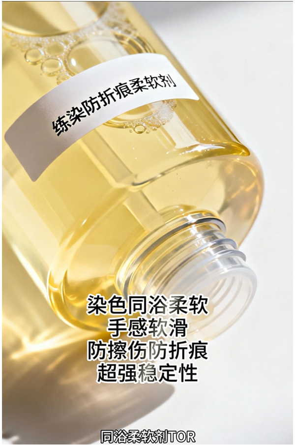 摘要:染色同浴柔软剂,浴中防折痕防擦伤,手感软滑,使生产加工更顺畅,节省硅油用量,降低成本和废水排放量。