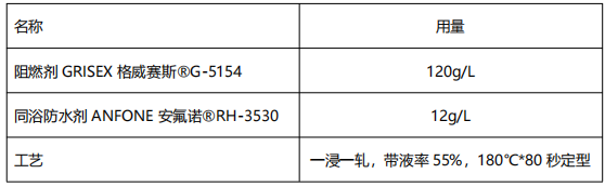 -功能性组合:使用GRISEX®G-5154阻燃剂与ANFONE®RH-3530防水剂进行同浴复配加工。