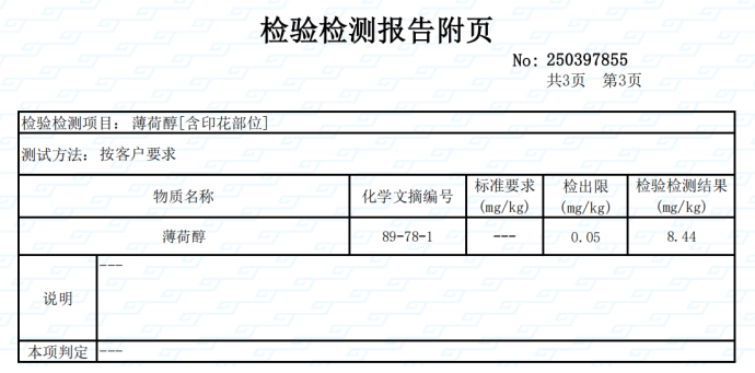经处理后的面料能做到凉感Q-max 0.24,薄荷醇含量送第三方检测: