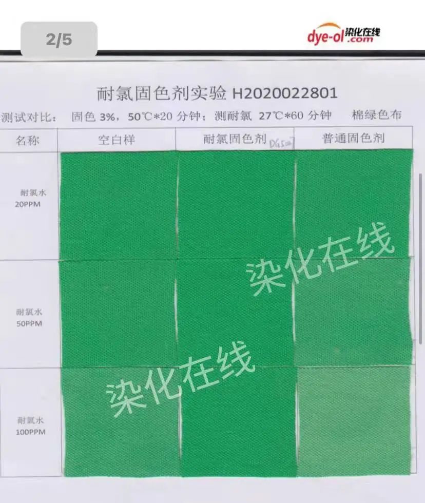 最后为您介绍一下耐氯固色牢度提升剂GRISEX格威赛斯® G-3005,这款产品的优势在于高浓、效果稳定、有极佳的色牢度和着色力、处理过后的耐氯牢度能够达到四级以上,稳定提升1-2级,且符合环保要求。