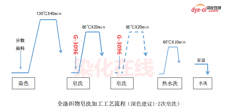如果色牢度要求高,可以在一浴皂洗工艺的基础上,在后整定型时使用牢度提升剂,可以做到水尾清澈,六纤维沾色4-5级以上。