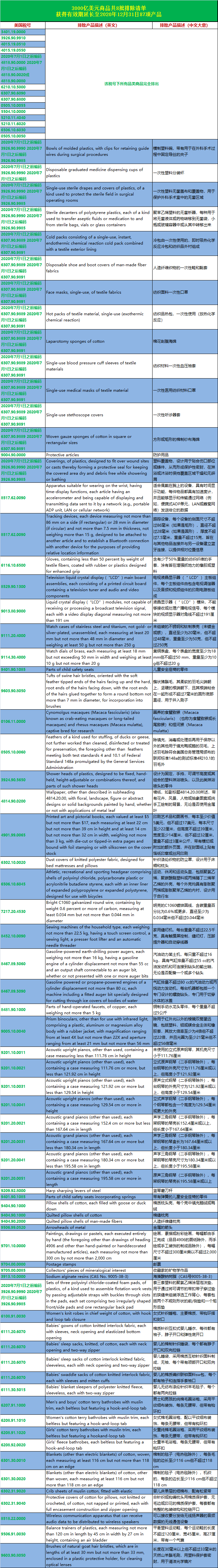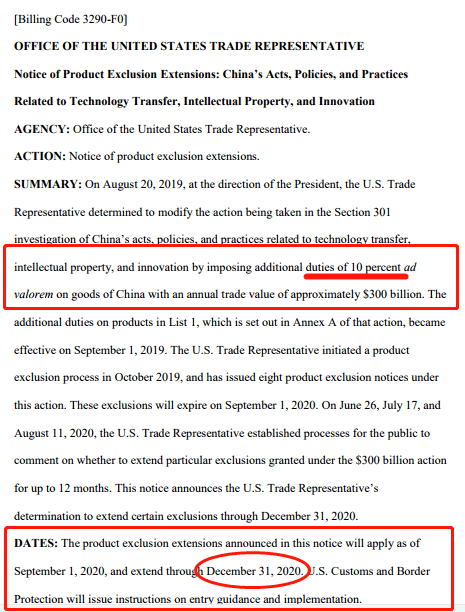 美国贸易代表办公室公告地址:https://ustr.gov/sites/default/files/enforcement/301Investigations/%24300_Billion_Exclusion_Extensions_August_2020.pdf