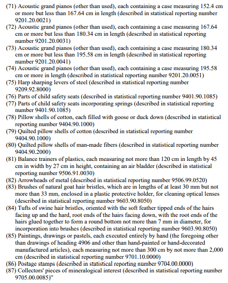 此次没有在排除名单内商品共涉及81个税号下128个品项的商品 ,9月1日起恢复加征7.5%关税,名单如下: